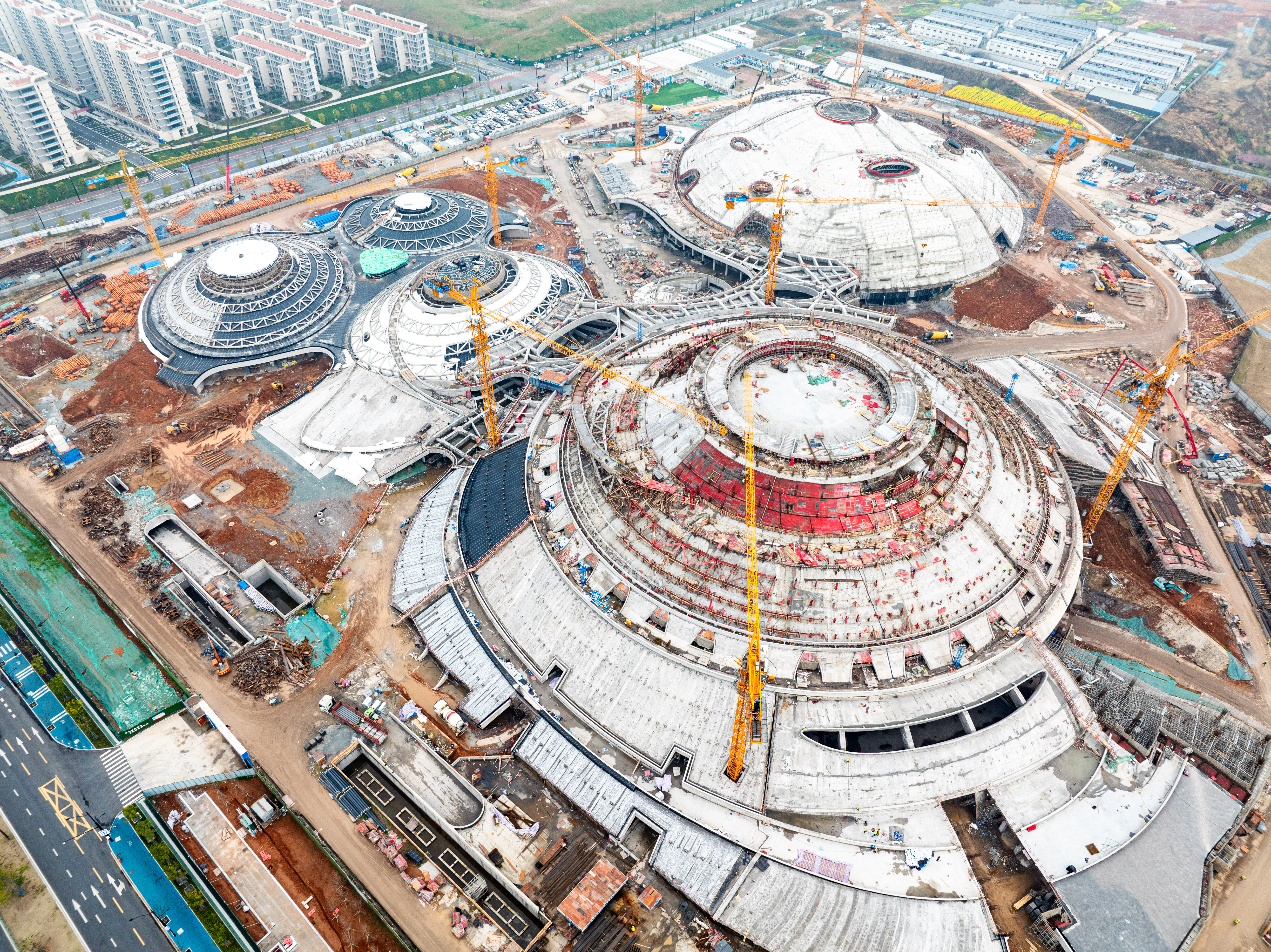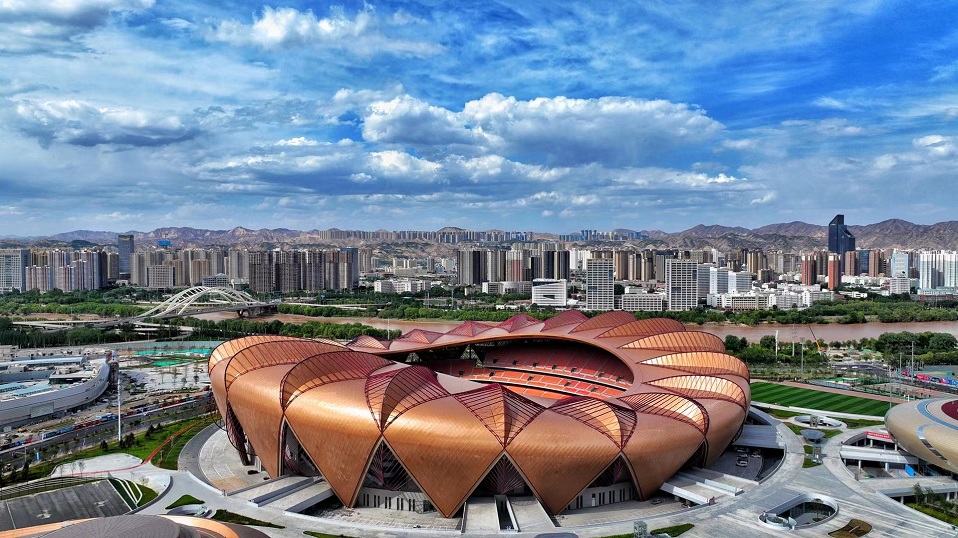 由中國十七冶承建的蘭州奧體中心,采用“飛天花舞”設(shè)計(jì)理念,建筑猶如五朵花舞動(dòng)于絲綢之路上,總建筑面積46.6萬平方米,由60000座玫瑰體育場(chǎng)、8000座郁金香綜合館、3000座百合游泳館、3000座荷花網(wǎng)球館、蘭花運(yùn)動(dòng)員公寓等單體組成。其中郁金香綜合館弦支穹頂是世界上首個(gè)吊掛大噸位斗形屏(40t)的矢跨比小于1/12的90米級(jí)大跨度弦支穹頂結(jié)構(gòu)工程。